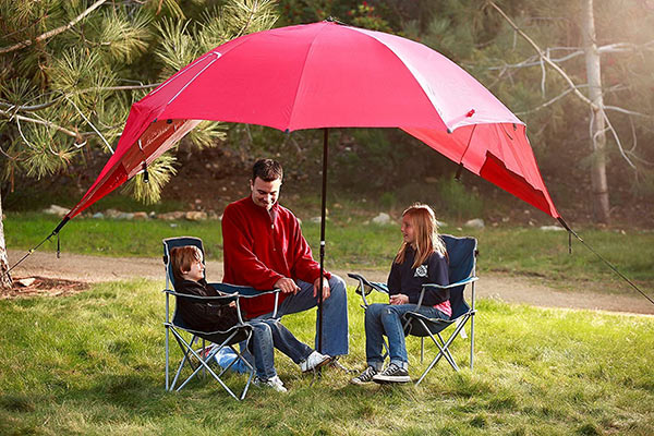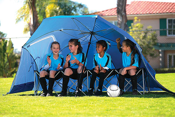 The 8 foot Umbrella provides easy, maximum protection to keep you sheltered from the sun, wind, and rain. It provides side flaps for full shelter protection, zippered windows for extra airflow, and internal pockets to store stakes or other valuables. It is lined with a UPF 50+ undercoating that blocks over 99.5 percent of the harmful UVA and UVB rays. The Super-Brella is a simplified version of the Sport-Brella and is still great for camping, sporting events, and the beach